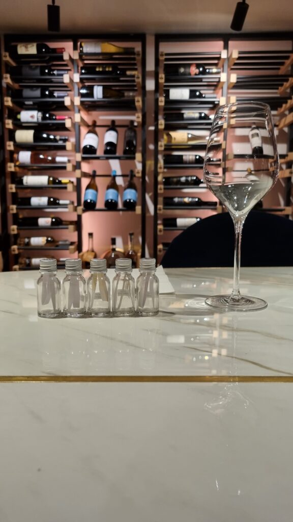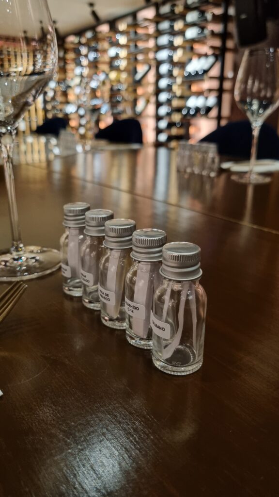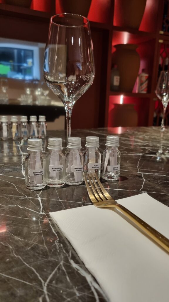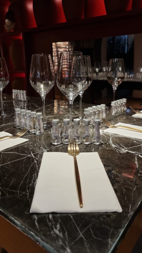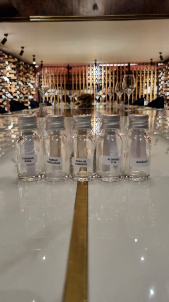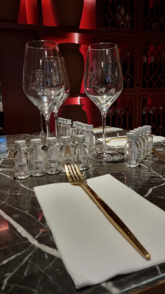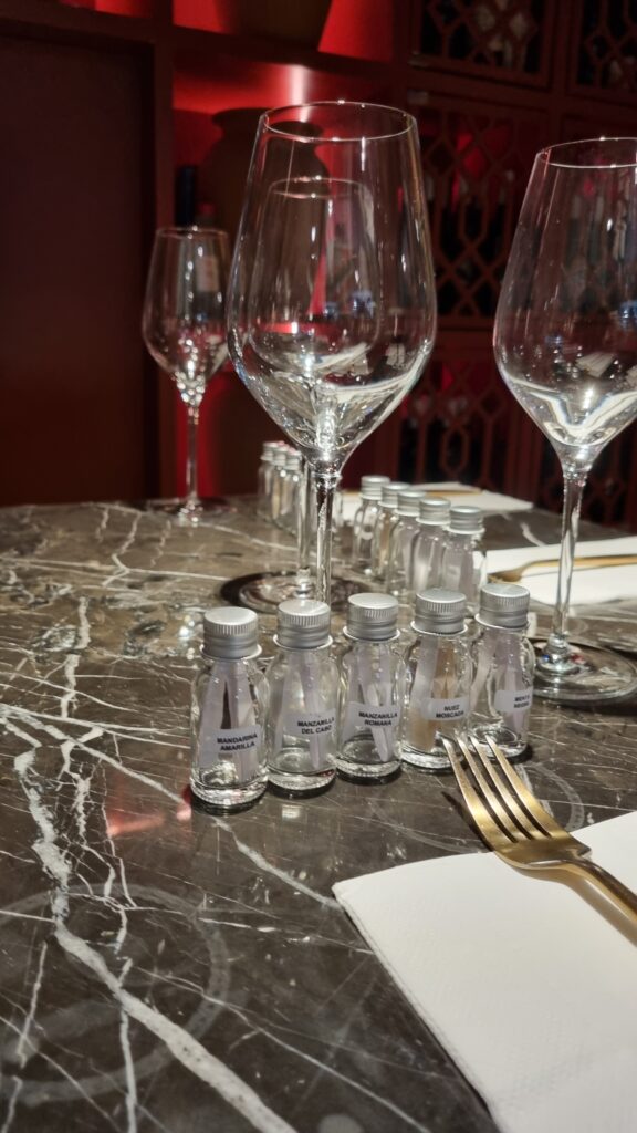 Cada etapa fue acompañada por una degustación culinaria pensada para resonar con los perfiles aromáticos del vino y los elementos perfumísticos, creando un diálogo sensorial entre lo que se bebe, se saborea y se huele. Más que una cata, fue una experiencia formativa y sensorial que profundizó su entendimiento del lujo a través del olfato, el gusto y la memoria.