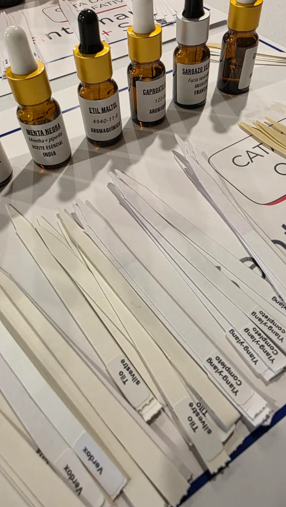 Evaluación olfativa de aromáticos, para entrenar el olfato y reconocer los matices presentes en cada té.