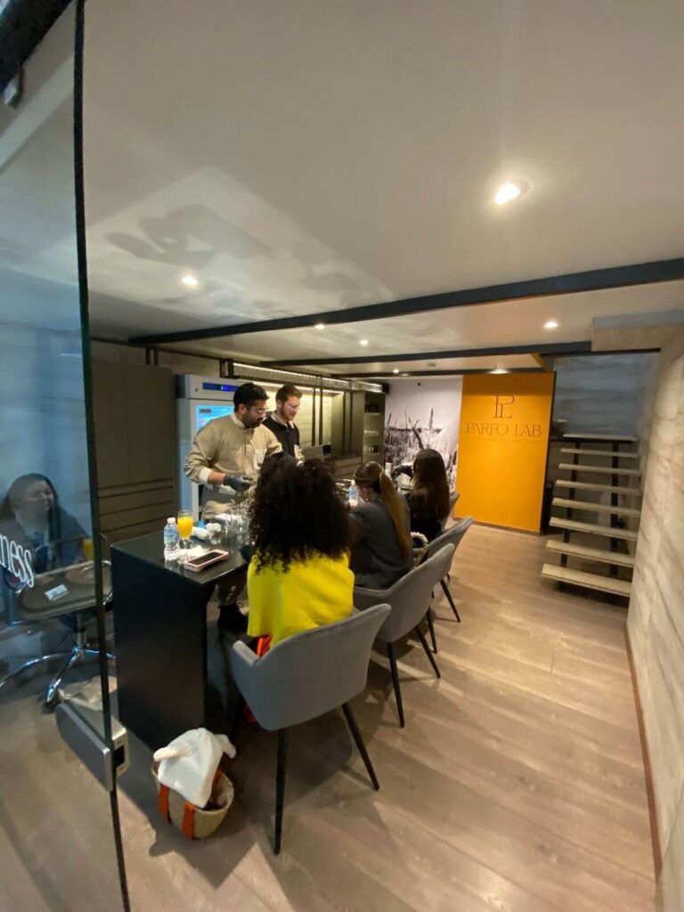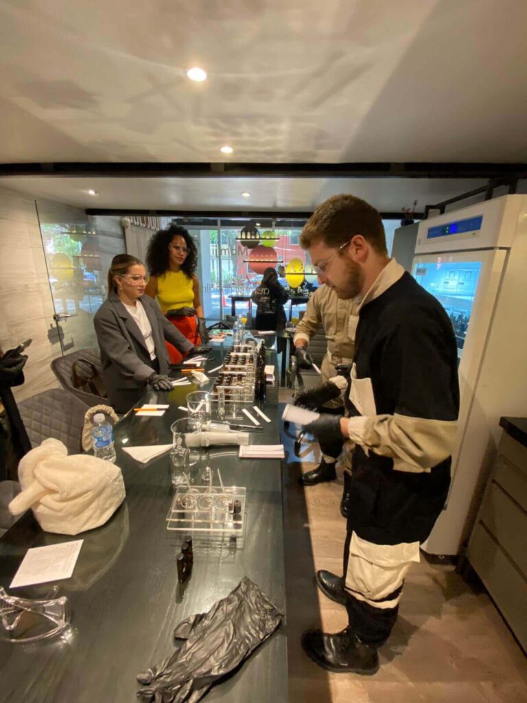 Complementando este obsequio, se llevaron a cabo catas olfativas escalonadas en pequeños grupos, diseñadas como talleres breves de entrenamiento olfativo. En cada sesión, los participantes exploraron materias primas naturales y sintéticas utilizadas en perfumería, aprendieron a identificar notas olfativas clave y descubrieron cómo se construyen las fragancias que nos acompañan en el día a día.